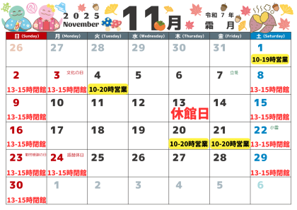 11月の休館日:11月13日(木)