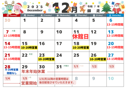 年内最終営業日・時間:12月28日(日) 9:00〜 16:00(一時閉館なし)